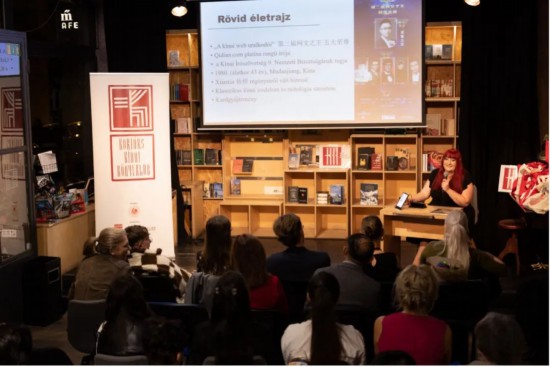 羅蘭大學(xué)中文專(zhuān)業(yè)在讀博士生祹絡(luò)嵐(Torma Laura)侃侃而談,介紹了作家王蒙的處女作長(zhǎng)篇小說(shuō)《青春萬(wàn)歲》。來(lái)自帕茲瑪尼·彼得天主教大學(xué)中文系的瑟普·巴林特(Szép Bálint)端著一小杯紅酒隨后登場(chǎng),他從后現(xiàn)代、怪誕、諷刺和魔幻現(xiàn)實(shí)主義四個(gè)特點(diǎn)解析了莫言的長(zhǎng)篇小說(shuō)《酒國(guó)》??夏崞潯P(yáng)卡(Kenéz Janka)和卓菲(Pádár Zsófia)分別推薦了蘇童的短篇小說(shuō)《游泳池》《櫻桃》和長(zhǎng)篇小說(shuō)《米》。羅蘭大學(xué)中文專(zhuān)業(yè)在讀碩士生楊康(Megyeri Janka)介紹了耳根的“仙俠”三部曲——《一念永恒》《仙逆》和《三寸人間》,她站在比較文學(xué)的角度闡釋了西方的魔法世界與東方的仙俠世界的異同。