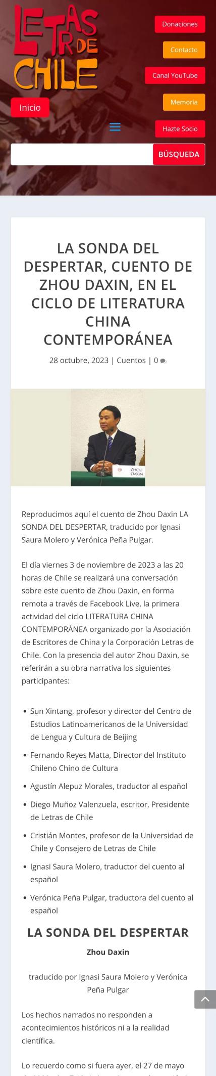 《首次喚醒》是周大新今年3月新發(fā)表的作品,經(jīng)智利“中國(guó)文學(xué)讀者俱樂(lè)部”推薦,由智利文學(xué)網(wǎng)(Letras de Chile)組織翻譯并于今年10月全文刊發(fā),一經(jīng)發(fā)布就引起了智利讀者的廣泛興趣。