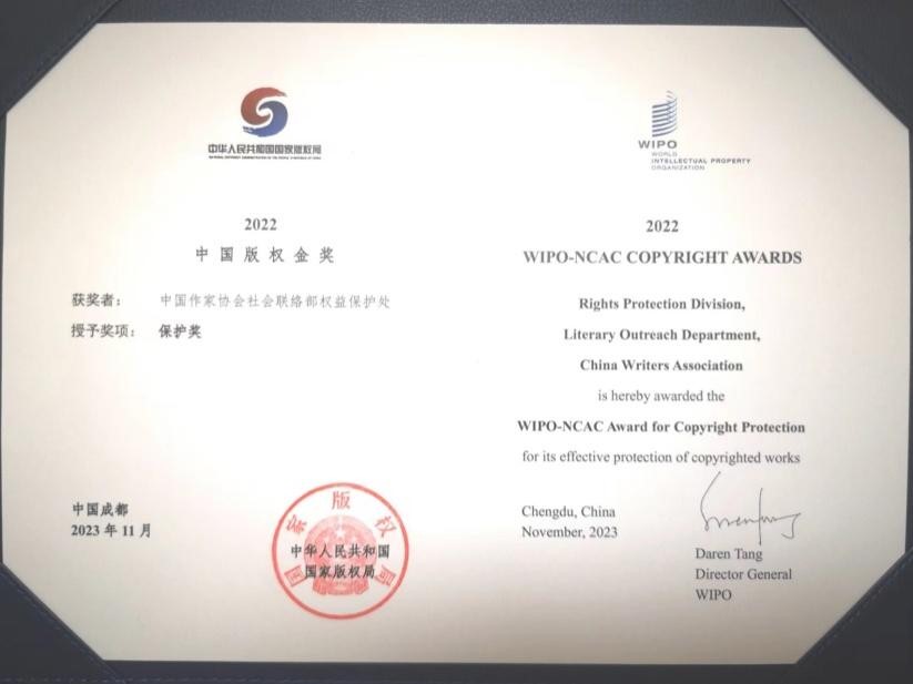 2022中國版權(quán)金獎頒獎 中國作協(xié)社聯(lián)部權(quán)保處榮獲保護獎