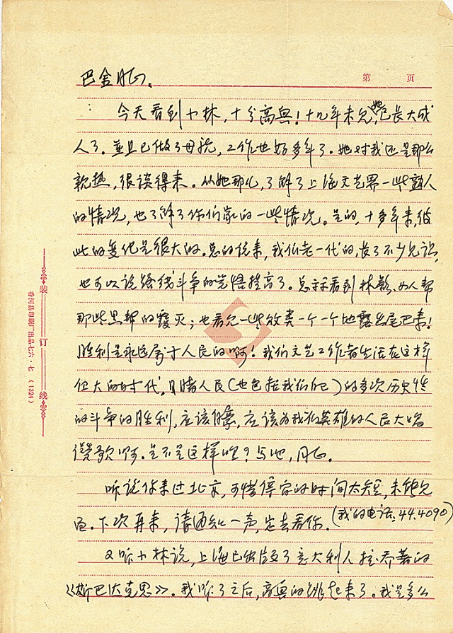 草明和巴金多年未有聯(lián)系,這次能夠書信往來,是通過巴金的女兒“小林”才聯(lián)系上的。這在草明致巴金第一封信中可以看出:“今天看到小林了,十分高興!”通過草明與小林的相見,才有了草明與巴金的書信往來。巴金的回信因草明的來信中沒有寫明通信地址,遲遲未回復(fù),通過小林才給草明回復(fù)了此信。書信內(nèi)容將巴金對草明的問候、感謝、無法早寫回信的緣由等說得清清楚楚。