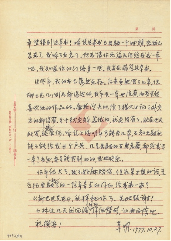 你年紀(jì)大了,我不好麻煩你,但如果方便的話,是否托出版社里的一位年青點的同志,給我辦一辦?