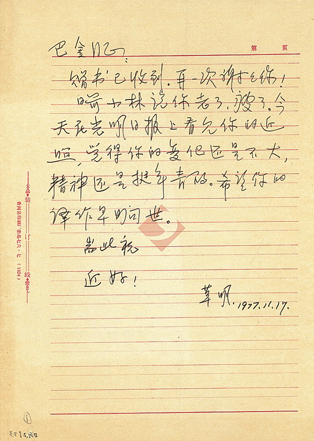 中國現(xiàn)代文學(xué)館的書信庫中珍藏著草明致巴金書信兩封,它們分別寫于1977年10月27日和1977年11月17日。從書信時間、內(nèi)容來看,顯然是草明寫給巴金的具有連續(xù)性的兩封書信,且兩封書信之間有巴金的回信一封。