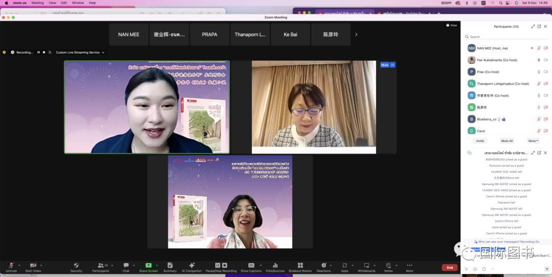 12月9日,由中國作家協(xié)會(huì)外聯(lián)部指導(dǎo),中國圖書進(jìn)出口(集團(tuán))有限公司聯(lián)合泰國南美書局舉辦了2023年泰國“中國文學(xué)讀者俱樂部”活動(dòng)——李東華作品《焰火》泰文版首發(fā)式暨閱讀分享會(huì)。泰國陳氏金出版社社長陳美琪、編輯盧伊惠,南美語言學(xué)院、泰國達(dá)叻男子中學(xué)學(xué)校漢語組學(xué)生以及泰國漢語教師等30多人在線參加。