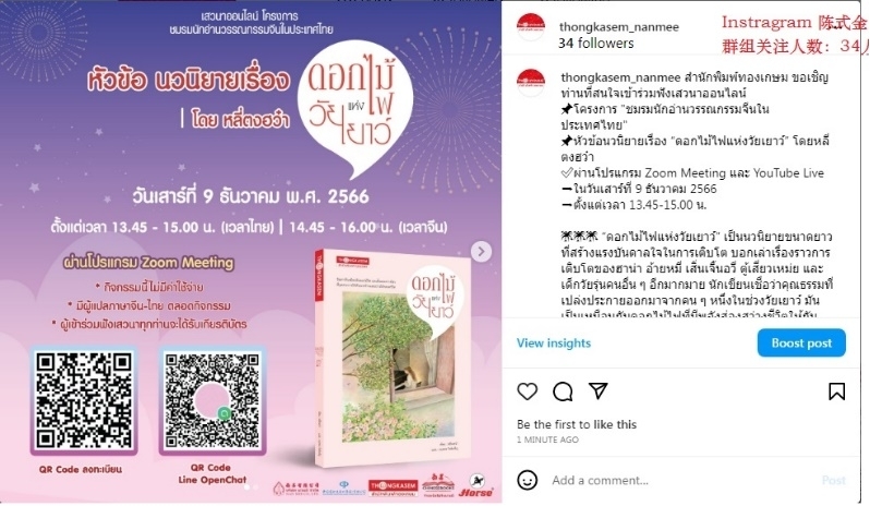本次活動(dòng)及作品推介的消息在泰國報(bào)紙《京華日?qǐng)?bào)》、《亞洲日?qǐng)?bào)》,并通過南美書局的臉書、影格等社交媒體賬號(hào)發(fā)布,經(jīng)由泰國漢語教師、學(xué)者等積極轉(zhuǎn)載,覆蓋泰國讀者約35萬人。