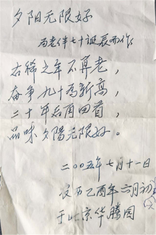 父親可能覺得這些打油詩文學(xué)水準(zhǔn)不高,就沒有給我這個(gè)文學(xué)教授看。而今,我捧讀手澤,五味雜陳。這兩首詩,真實(shí)地記錄了父母在長達(dá)近70年共同生活中的感悟,還有那種堅(jiān)強(qiáng)樂觀的人生態(tài)度。只有我知道,父親為此付出了多少委屈和艱辛,詩中又隱含著多少關(guān)愛和期待。