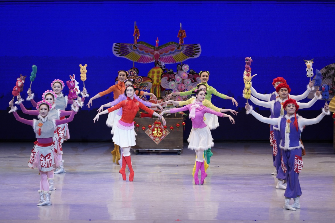 舞臺上,紅彤彤的燈籠、喜慶的春聯(lián)、熱鬧的廟會奏響了中國農(nóng)歷新年的序曲;“團(tuán)團(tuán)”和“圓圓”家的年夜飯彰顯了中國禮儀之邦的待客之道、尊老愛幼的傳統(tǒng)美德,一張全家福更傳達(dá)了中國人對親情的重視和對團(tuán)圓的向往;“胡桃夾子”大戰(zhàn)“年”獸,則充滿童趣地演繹了“過年”的傳說;而當(dāng)寓意吉祥的仙鶴在蒼勁的松樹下迎著朝陽翩翩起舞——一幅“松鶴延年”的祥瑞畫卷中,西方芭蕾藝術(shù)在中國文化意象中煥發(fā)出了美妙的東方神韻;扇子舞、絲綢舞、糖葫蘆舞、風(fēng)箏舞、陀螺舞、金元寶舞、瓷器舞,一派頗具中國元素的慶典場面讓阿聯(lián)酋觀眾游歷在瑰麗多姿的中國傳統(tǒng)文化藝術(shù)長廊中,在歡樂祥和、喜慶溫馨的氣氛中與“團(tuán)團(tuán)”“圓圓”一家共同迎接中國農(nóng)歷新年的到來……