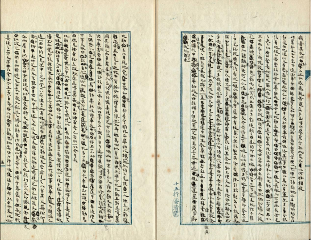 魯迅與周作人,這對中國文學現(xiàn)代史上的雙子星座,后來反目,但早年卻是“兄弟怡怡”,有很多共同從事文學活動的記錄,目前仍留存的相關見證物并不少,但是兄弟二人合作手稿并不多見。上海魯迅紀念館藏有一份周作人捐贈的翻譯手稿,卻是一件目前罕見存世的兩人早年深度合作的見證物。距今已經104年。這是經過簡單手工裝訂的一小冊,連封面共18頁。手稿用“金清堂”15行藍格直行的日本皮紙稿紙,毛筆豎寫,計約12000余字。封面上有周作人筆跡:“神蓋記 稿 一九一○年所譯 魯迅改本 原擬用于域外小說集第三冊者”。內頁是由周作人起草,魯迅修改的文本。字跡是蠅頭小楷,繕寫得密密麻麻,魯迅的修改字跡更為細小。有幾頁已經改得面目全非了:有劃掉的,有打圈表示刪除的,有旁添的,也有眉添的,有的整句刪改,甚至整段旁添。還有前后句調換等等情況。由于稿紙行距本來比較窄,改添的內容比較多,因此字體更加細小,有的還因字體潦草,字跡模糊,讀來十分吃力。還有以濃墨涂抹的,要想辨識被涂去的內容就更加費勁了。