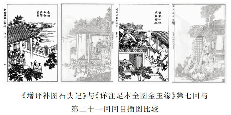 除了對人物繡像的增補,同文書局還開創(chuàng)了《紅樓夢》回目插圖的先河,將每一回關目由文字轉變?yōu)閳D像,使繡像人物成為活動在具體的空間背景、情感關系之中的個體,對于以往單純閱讀文字的讀者來說,有了更為直觀的想象與回應。值得注意的是,同文書局本的回目文字在目錄、正文與圖像之間出現(xiàn)的差異,似乎也反映出在出版前的整理工作中,書局是采用不同的小說底本,分別進行的工作。比如小說第七回與第二十一回回目,如前所述,《增評補圖石頭記》《詳注足本全圖金玉緣》在目錄與正文的回目上與雙清仙館刊本相同,都是“赴家宴寶玉會秦鐘”和“俊襲人嬌嗔箴寶玉”。但《增評補圖石頭記》的回目插圖卻都采用了程甲本或東觀閣本的回目“寧國府寶玉會秦鐘”和“賢襲人嬌嗔箴寶玉”,由此形成回目插圖與回目之間的抵牾,直到《詳注足本全圖金玉緣》時,目錄、插圖和正文才統(tǒng)一起來。