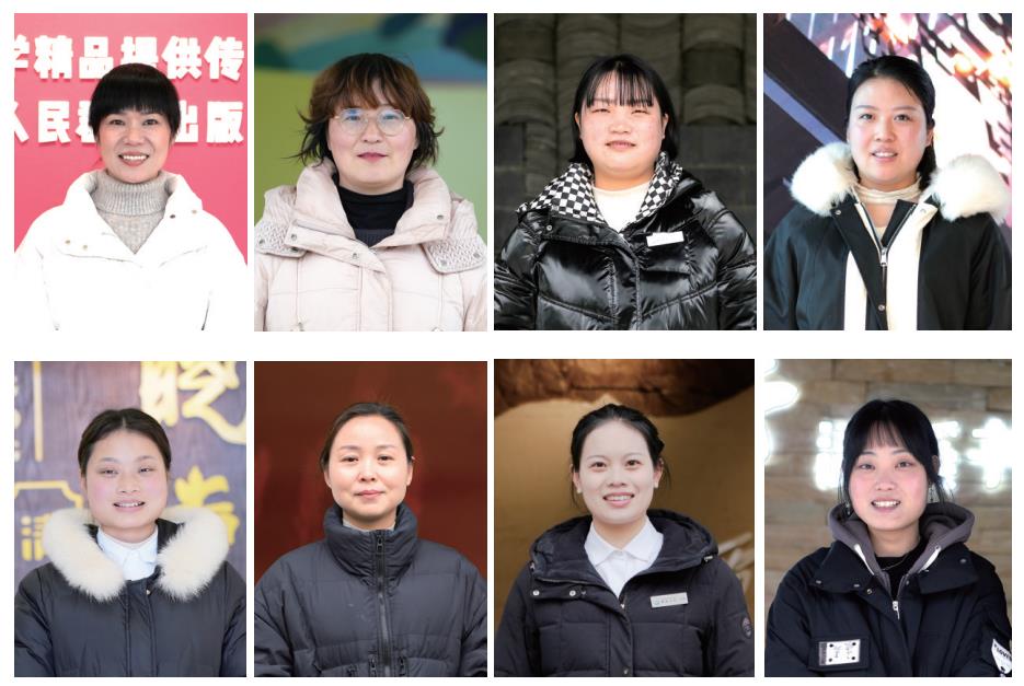 第一排(從左至右):劉勝男(作家出版社書屋)、李群芳(兒童文學(xué)書屋)、郭蓉(王躍文書屋)、李葉青(劉慈欣書屋);第二排(從左至右):鄧佩玲(梁曉聲書屋)、姚小玲(莫言書屋)、徐英(賈平凹書屋)、繆青湘(劉震云書屋)