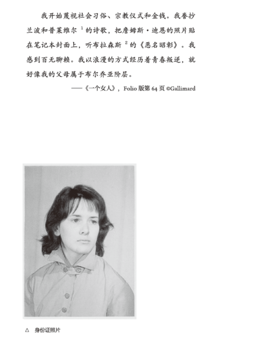 她是學(xué)校里的優(yōu)等生,她最喜歡上語文課,她要用一種近乎外語的法語來寫作,因?yàn)樗粘I钪械姆ㄕZ充滿了俗語和方言,并非是那個(gè)用詞嚴(yán)謹(jǐn)、語法規(guī)范的法語。她如饑似渴地閱讀書籍,《魔鬼附身》這樣的書名聽著就大逆不道,薩岡的青春小說幫助她想象那個(gè)小資的美好世界,就像她后來在小說中寫道:“我以浪漫的方式經(jīng)歷著青春叛逆,就好像我的父母屬于布爾喬亞階層?!?/p>
