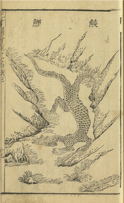 《山海經(jīng)》記載的說鯥其狀如牛,所以《山海經(jīng)》的插圖都把鯥畫成牛的樣子,到明清時期直到晚清時期的一些畫里面,又把穿山甲畫得像揚子鱷。為什么穿山甲后來又變成鱷魚了呢?這依然跟書的記載有關(guān)系,因為到了宋代以后的古書上都說穿山甲長得像鱷魚一樣。宋代羅愿的《爾雅翼》說,“鯪鯉,四足,似鼉而膽小”,鼉就是揚子鱷,南方人叫它豬婆龍,李時珍《本草綱目》也說,“鯪鯉,狀如鼉而小”,都把穿山甲比作揚子鱷,所以后來的人畫穿山甲就畫成了鱷魚。大家看這兩幅畫,左邊這幅就是見于一本古書,一本明代古書,叫《三才圖會》,它里面就畫有穿山甲,你看它上面寫著“鯪鯉”,這是穿山甲,你看他畫的就一個爬行動物嘛,與其說是穿山甲,不如說更像鱷魚。