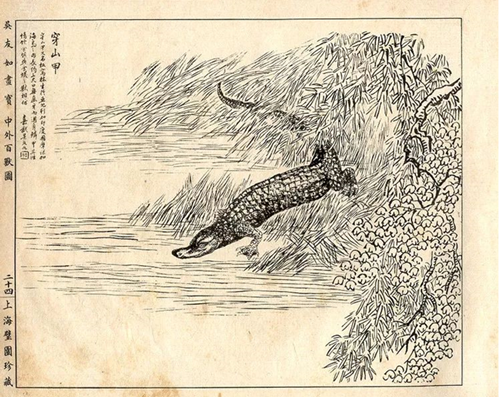 再看這幅畫,這是晚清著名畫家吳友如畫的,吳友如辦過一本《點石齋畫報》很有名,他的畫都很寫實,但畫的這本《中外百獸圖》里面的穿山甲,卻畫得根本不像穿山甲,更像鱷魚。為什么他們都把穿山甲畫成鱷魚了?因為他們都沒有見過真的穿山甲或穿山甲的照片,他們只能根據(jù)書本的描述來想象描摹這個穿山甲,他們看《本草綱目》等書說龍鯉像揚子鱷,就照著揚子鱷的樣子畫穿山甲。