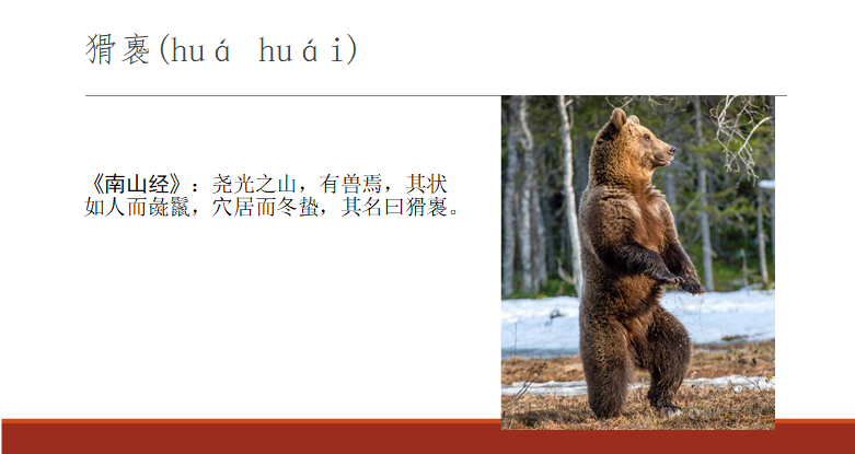 《南山經(jīng)》說:“堯光之山,有獸焉,其狀如人而彘鬣,穴居而冬蟄,其名曰猾褢,其音如斲木,見則縣有大繇?!眻蚬庵缴嫌蟹N野獸,樣子長得像人,長著跟豬一樣的鬃毛,住在洞穴里面,冬天要冬眠。這一看就是黑熊。黑熊會像人一樣站立,所以說它“其狀如人”。東北的狩獵民族鄂倫春、鄂溫克等,非常崇拜熊,他們依然把熊想象成人,敬若神明。