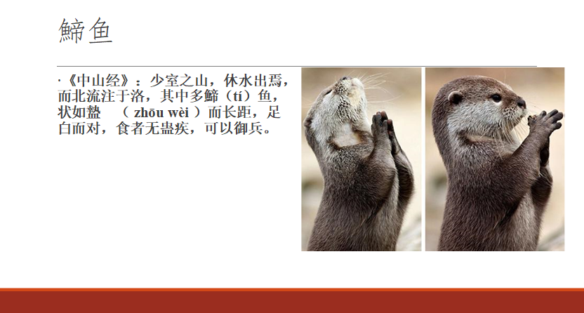 再看一種,《中山經(jīng)》:“少室之山,休水出焉,而北流注于洛,其中多?(tí)魚,狀如蜼( zhōu wèi )而長距,足白而對,食者無蠱疾,可以御兵?!甭逅杏幸环N魚叫?魚,長得像猴子(蜼)一樣,長著長長的腳指頭(長距),腳心是白色的,喜歡把手對一塊拍巴掌(足白而對),這就是水獺。水獺不是魚類,但水獺它生活在水里面,所以古人把它稱為魚。水獺長得確實跟猴子體型、顏色都很像,它的指頭非常長,因為它生腳蹼,并起來顯得它的指頭很長,它的巴掌是白色的,經(jīng)常雙手合十,像是拍巴掌的樣子。由此可見,古人的觀察是多么細(xì)致而準(zhǔn)確。我們知道水獺喜歡吃魚,它捉了魚吃不了會擺在河岸上,又因為它喜歡雙手合十拍巴掌,古人看它經(jīng)常對著捕獲的魚雙手合十,就誤認(rèn)為它在向魚做禮拜,所以古書中有“獺祭魚”的說法。小朋友都知道日本非常有名的一個怪物叫河童,河童的腦袋中心不長毛,它喜歡把水邊的人或者動物拖到水中去,河童其實就是從水獺演變過來的,最早就記錄在《山海經(jīng)》里面。