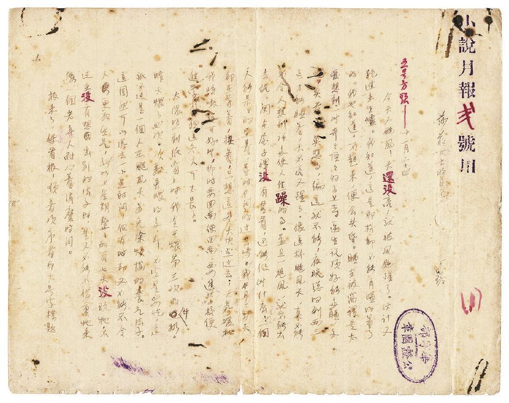 此次展覽陳列的51位作家75件手稿中,筆跡風(fēng)格千姿百態(tài),作家生命性情畢現(xiàn)。丁玲的小說《夢珂》是處女作,《莎菲女士的日記》是成名作,兩部短篇小說都是葉圣陶慧眼識珠,發(fā)表在上海的《小說月報(bào)》上,其手稿奇跡般地被保存下來。作者的鋼筆手跡,字體圓潤,鋒芒自若,不刻意,不做作,洋洋灑灑,一瀉千里,其筆力之雄厚,文氣之豐沛,令人為之神往。編輯用毛筆在手稿上留下的修改文字,很老到,很認(rèn)真,頗見慧眼匠心。