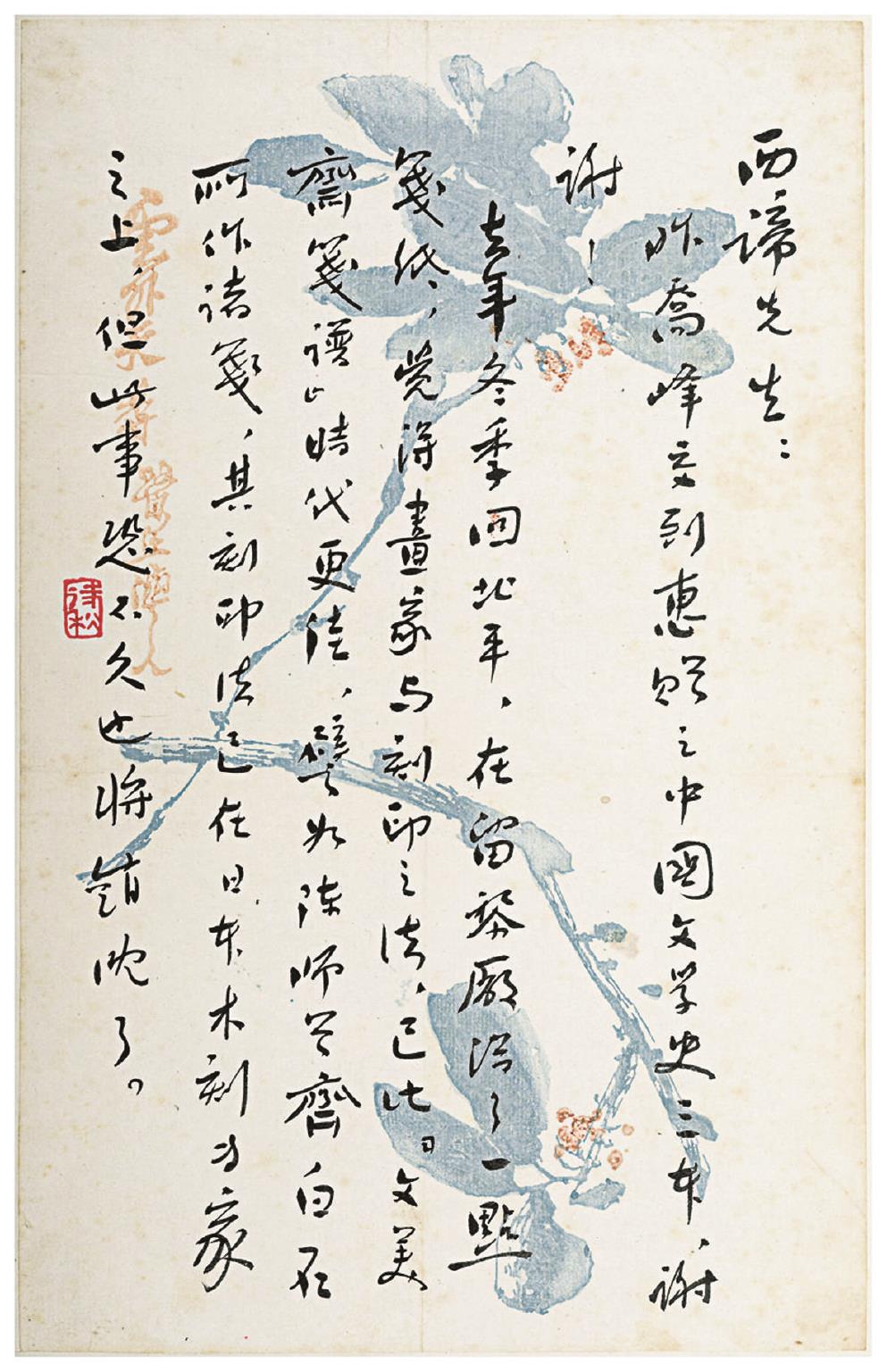 魯迅的書信主要用毛筆書寫,其中最值得稱道的是用毛筆寫在花箋宣紙上的信函,完全是一派傳統(tǒng)文化人之間的敬稱與謙和,紙短情長,溫文爾雅,筆墨如行云流水,或酣暢淋漓,或圈改涂鴉,松香墨跡,宣紙柔韌,襯托國畫花鳥圖案簡潔背景勾勒,筆走其間,有如穿越花草,隔空對話。并且,魯迅字體端莊秀麗,意蘊(yùn)深厚,從容不迫,素凈雅致,書寫在有質(zhì)感、有美感的特制信箋上,讓人望而脫俗,澄凈心懷。在魯迅的往來書信中,享有如此規(guī)格的受箋者并不多,給鄭振鐸(西諦)、趙家璧的信箋,都是表達(dá)崇高敬意和深厚謝意的。其次是書寫在黃傘格宣紙,再次是白凈宣紙上的信箋,都可以感受到紙凈墨香的素雅品質(zhì)。后來,用鋼筆、圓珠筆寫在單位辦公用紙上的信件,那就是又當(dāng)別論了。