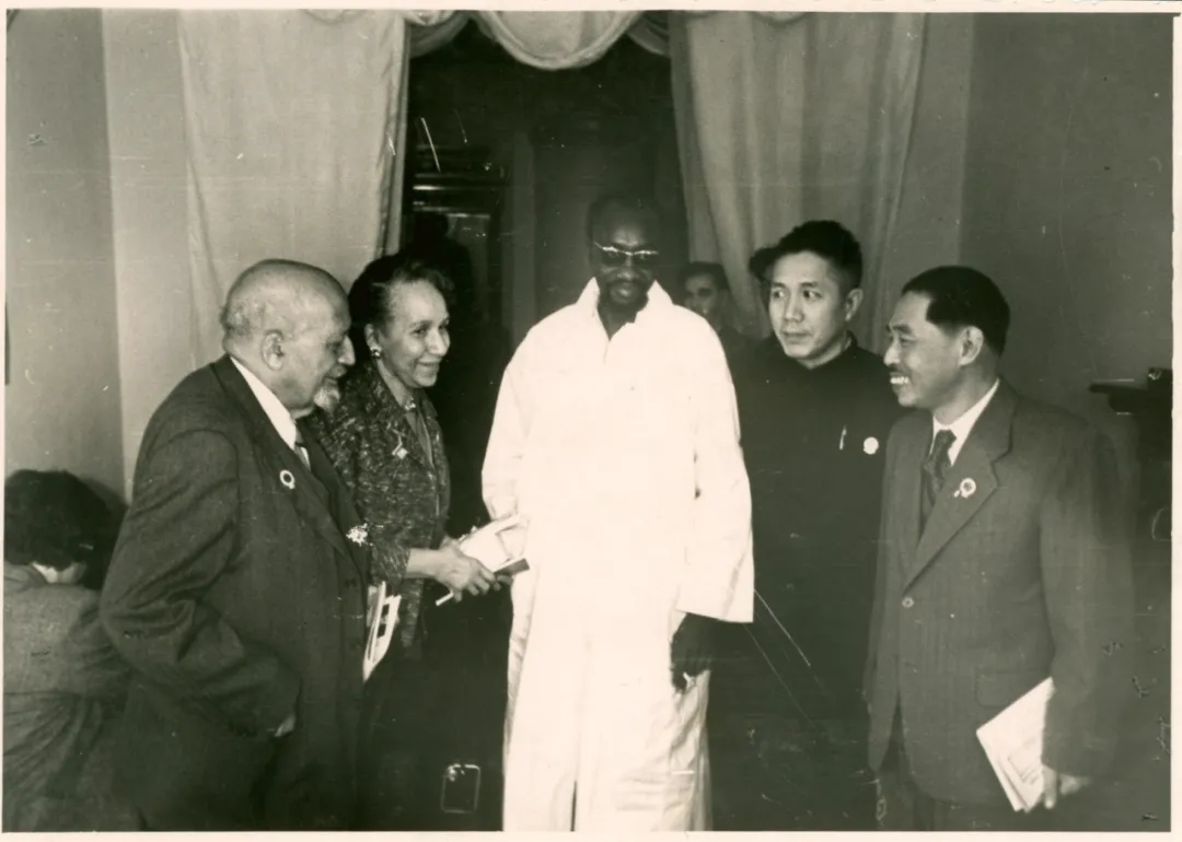 圖2 周揚(yáng)、茅盾與美國(guó)作家W·E·B·杜波依斯、雪莉·格雷厄姆·杜波依斯、塞爾加爾作家,政治家馬杰蒙·迪奧普在亞非作家會(huì)議上。來(lái)源:馬薩諸塞大學(xué)阿默斯特分校圖書(shū)館特藏和大學(xué)檔案館,網(wǎng)址:https://credo.library.umass.edu/