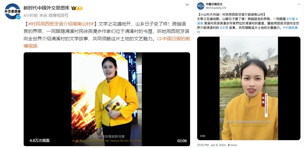 在互聯(lián)網(wǎng)上,#村民用西班牙語介紹湖南山村# #東北人在湖南農(nóng)村找到歸屬感#等話題登陸熱搜被年輕人熱議。清溪村的村民用國際化的語言驕傲地向海外網(wǎng)友介紹清溪村的作家書屋和山鄉(xiāng)美景,引發(fā)海外網(wǎng)友熱評(píng);湖南文旅、黑龍江文旅遙相互動(dòng),帶來全網(wǎng)超400萬的話題關(guān)注度。