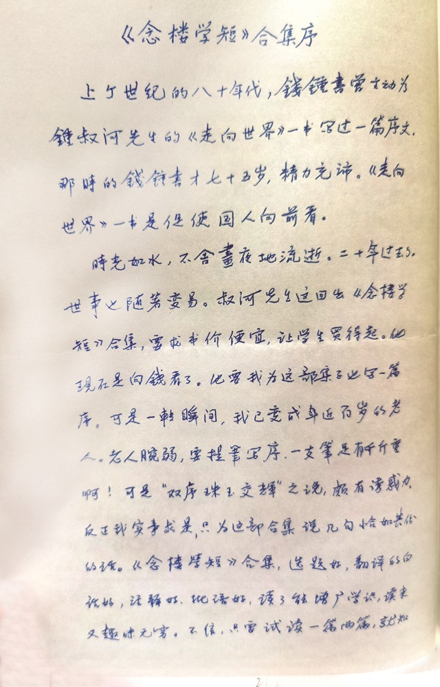 楊絳為鐘叔河的《念樓學(xué)短》合集所作的序