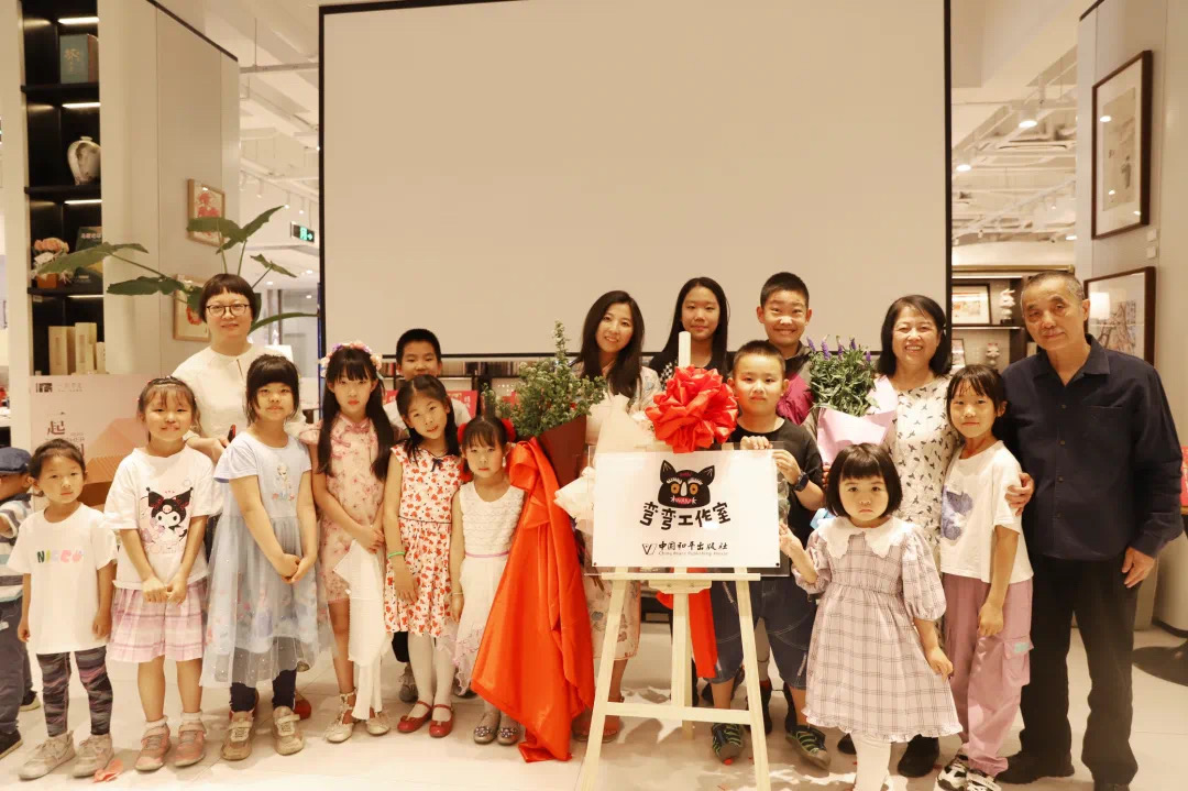 最后,北京航空航天大學(xué)新媒體藝術(shù)與設(shè)計學(xué)院教授顏新元為作者獻(xiàn)花,并與劉雪純、彎彎以及小朋友們一起為“彎彎工作室”揭幕。
