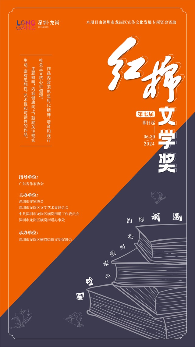 第七屆“紅棉文學獎”是深圳市龍崗區(qū)宣傳文化發(fā)展專項資金資助項目,由廣東省作家協(xié)會指導,深圳市作家協(xié)會、龍崗區(qū)文學藝術界聯(lián)合會、中共深圳市龍崗區(qū)橫崗街道工作委員會、深圳市龍崗區(qū)橫崗街道辦事處聯(lián)合主辦,真誠歡迎所有漢語寫作者踴躍投稿。