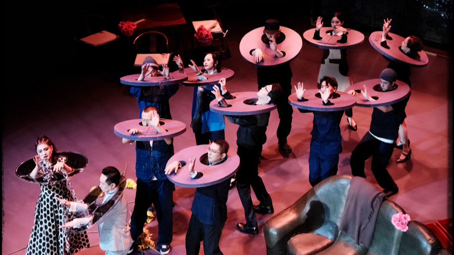 整部戲中演員的表演呈現(xiàn)出類似武俠小說(shuō)的江湖氣,每一個(gè)人物都帶著自己的欲望出現(xiàn),每一個(gè)人物實(shí)現(xiàn)自己目的的招式又各不相同。張弛有度、步步緊逼的巧玲,愛(ài)憎分明的瘦馬,綿里藏針的牛布(白凱南飾),活在劇中又跳出整部劇的行為藝術(shù)燈罩、命運(yùn)詠嘆調(diào)的歌者(么紅飾),出場(chǎng)時(shí)廣東話口音后又一口山東方言的黃大師(李龍吟飾)……不同的表演方式、不同的口音,組合成現(xiàn)實(shí)生活中五湖四海的生活原貌,表演的生動(dòng)性匯集在虛實(shí)交錯(cuò)而不失真的舞臺(tái)行動(dòng)中,讓莫言劇本中魔幻、荒誕但不脫離現(xiàn)實(shí)主義的特點(diǎn)得到了精準(zhǔn)的舞臺(tái)呈現(xiàn)。