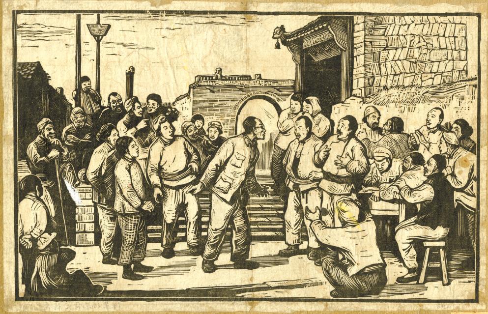 古元《馬錫五同志調(diào)解婚姻案》黑白木刻(1944年)