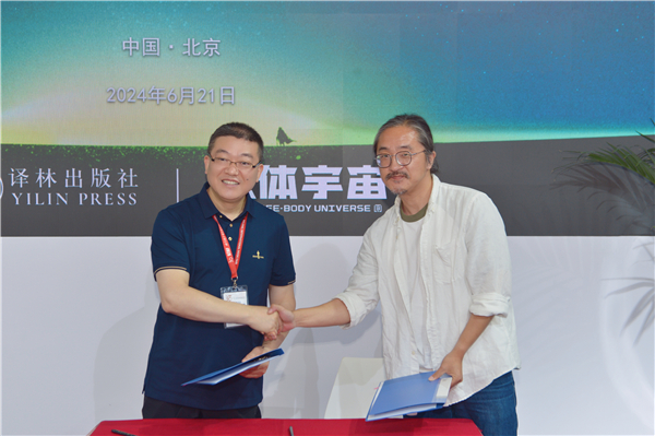 譯林出版社社長(zhǎng)葛慶文(左)、三體宇宙內(nèi)容中心負(fù)責(zé)人季煒銘簽署《三體》圖像小說(shuō)合作協(xié)議