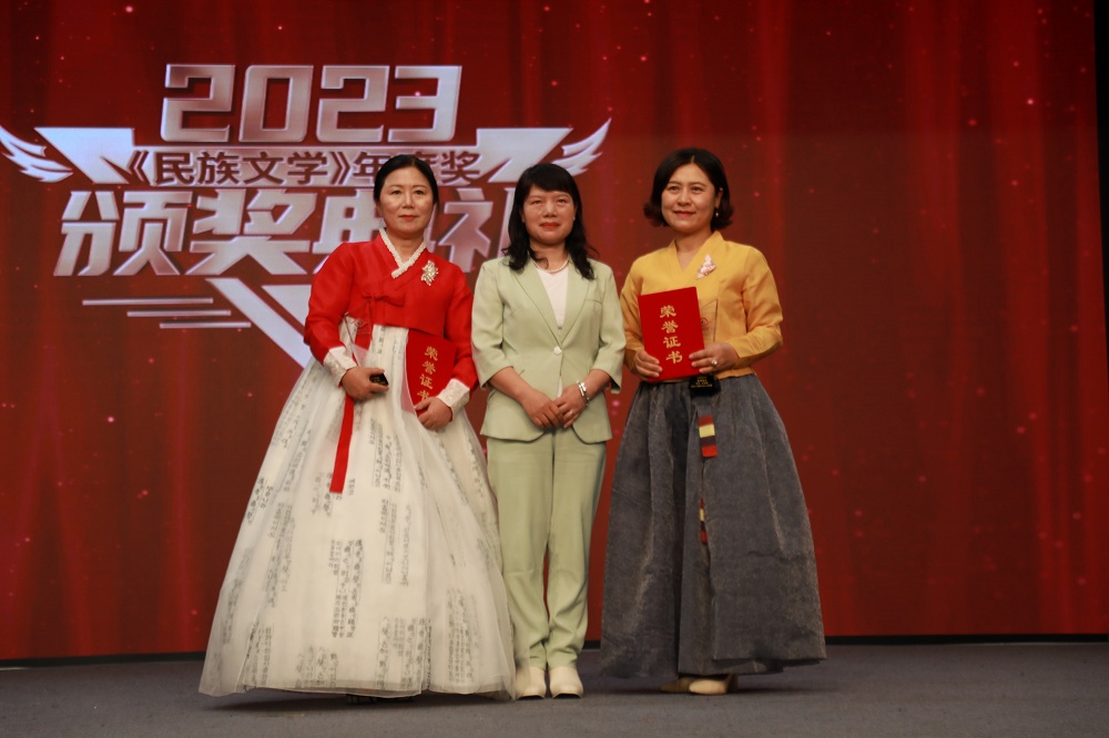 楊玉梅為《民族文學》朝鮮文版獲獎作家翻譯家李順花、金海鷹頒獎