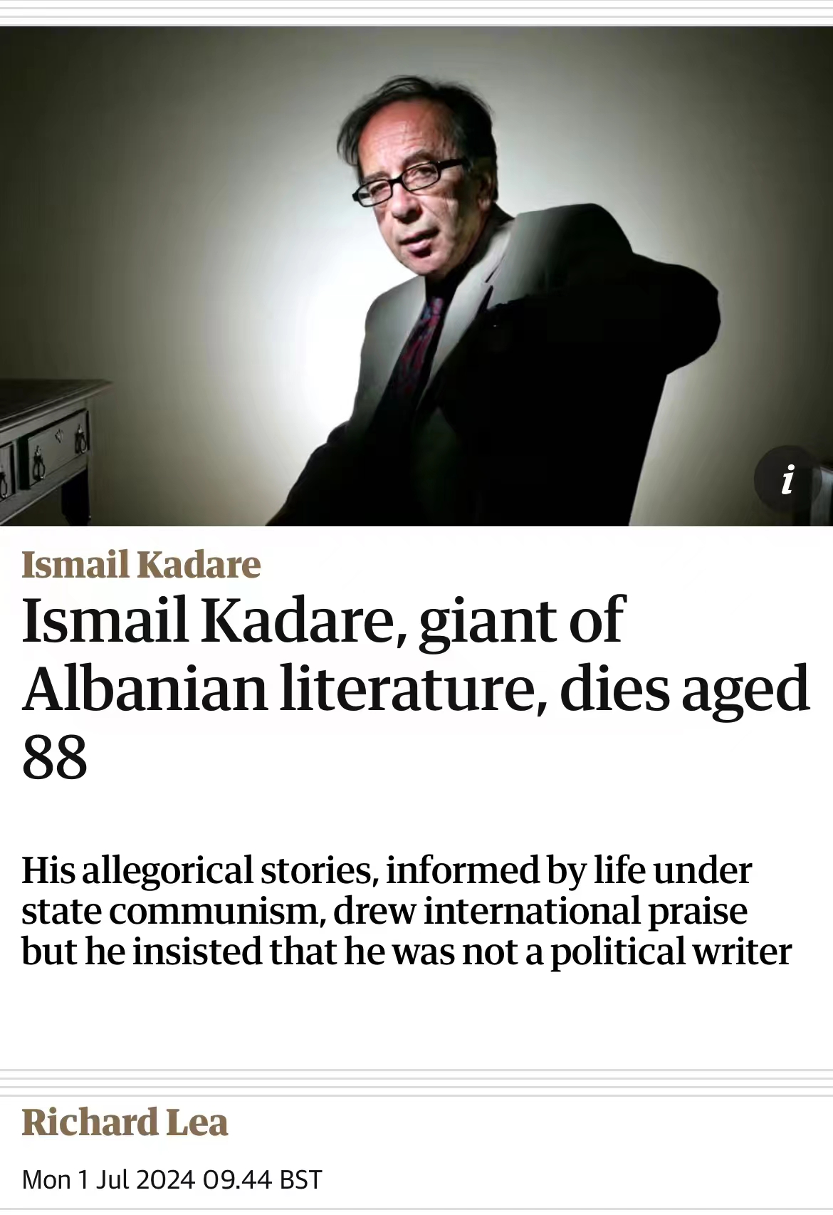 當(dāng)?shù)貢r間7月1日,阿爾巴尼亞當(dāng)代最著名的作家和詩人、首屆布克國際文學(xué)獎得主、諾獎熱門候選人伊斯瑪依爾·卡達(dá)萊逝世,享年88歲。