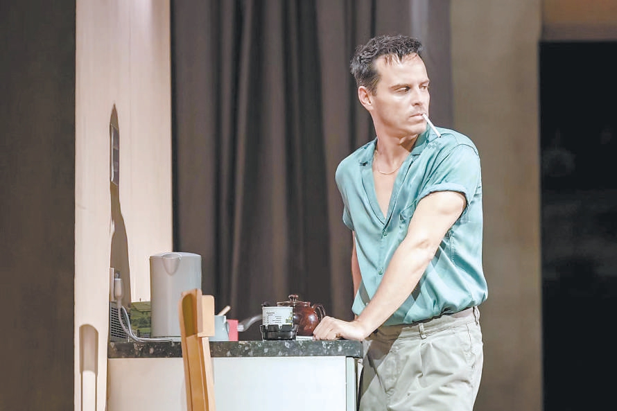 如同安德魯·斯科特在采訪中曾提到的,將自己投射到所有角色的過程,使他逐漸意識(shí)到這些角色之間的相似之處。契訶夫《萬尼亞舅舅》中的所有人物,內(nèi)心都充滿苦悶,但生活循環(huán)往復(fù),痛苦無從解答,勞累和重荷不曾止息,疲乏和困頓是日常的底色。由一人飾演全部角色的《萬尼亞》,恰恰強(qiáng)化了這種悲劇的普遍性。安德魯·斯科特對(duì)道具的使用和對(duì)肢體的掌控非常精準(zhǔn),開關(guān)門、推拉酒杯、手的撫摸等都由兩人間的呼應(yīng),轉(zhuǎn)變?yōu)橐粋€(gè)人的自我拉扯和掙扎不休。靈巧自如的轉(zhuǎn)換間,展露的情緒也有了多重含義。索尼婭的苦澀也流淌在伊萬醉酒后的眼淚中,海倫娜和醫(yī)生的對(duì)手戲里,男女兩人的情愫與壓抑都盛滿在安德魯·斯科特那自帶憂郁、破碎氣質(zhì)的一雙眼眸之中。