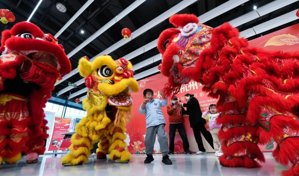小朋友在杭州非遺年貨節(jié)現(xiàn)場與傳統(tǒng)舞獅表演互動。