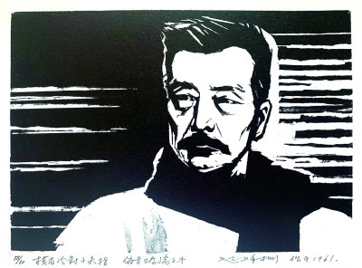 在此畫的構(gòu)思中,賴少其沒有一味地突出魯迅形象之高大而使之充塞整個(gè)畫面,而是將魯迅的頭像設(shè)計(jì)在小小的墨瓶上,與右側(cè)燃燒自己、照亮他人的蠟燭相呼應(yīng)。賴少其在畫作中并沒有簡(jiǎn)單地堆放書和筆這類塑造知識(shí)分子形象的常用物象,而是從自己對(duì)魯迅精神的理解出發(fā),充分發(fā)掘木刻藝術(shù)黑中見白的語言特質(zhì),采用以物喻人的方式塑造了魯迅為青年的進(jìn)步甘為“一木一石”的形象,別具深度。