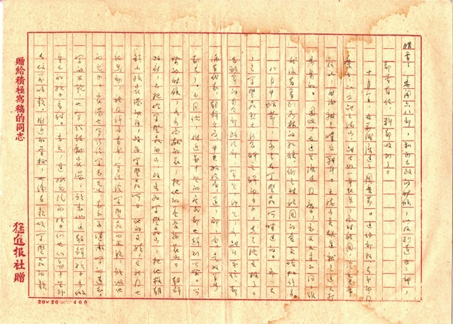 最后一封寫(xiě)于10月6日的信可被視為這段激流生活的片尾預(yù)告。由于當(dāng)晚收到47軍軍報(bào)《猛進(jìn)報(bào)》的約稿,所以便用猛進(jìn)報(bào)社所贈(zèng)的印有“贈(zèng)給積極寫(xiě)稿的同志”的5頁(yè)紙來(lái)寫(xiě)信。李蕤向妻子報(bào)告了一件喜事,那就是他在朝鮮與七年未見(jiàn)的妻弟白玉重逢,二人促膝長(zhǎng)談過(guò)去和新生活,最為慨嘆的便是當(dāng)年被國(guó)民黨抓兵之后的悲慘,與逃脫之后在共產(chǎn)黨這里獲得的解放形成了鮮明對(duì)比。同時(shí),他還囑咐妻子可無(wú)需再往朝鮮給自己寫(xiě)信,因?yàn)榛氐阶鎳?guó)的日子近了。