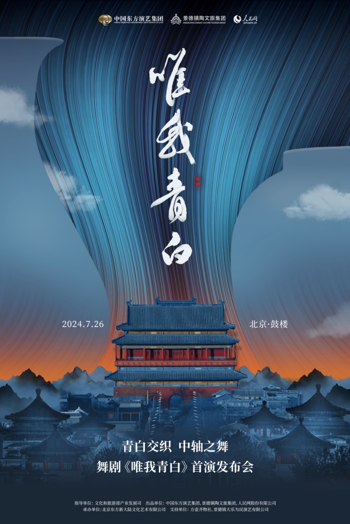 穿越千年,唯我青白。青白交織,中軸之舞。7月26日晚,由文化和旅游部產(chǎn)業(yè)發(fā)展司指導(dǎo),中國(guó)東方演藝集團(tuán)、景德鎮(zhèn)陶文旅集團(tuán)、人民網(wǎng)股份有限公司共同出品的舞劇《唯我青白》首演發(fā)布會(huì)在北京鼓樓舉辦,以舞樂(lè)讓百歲鼓樓煥發(fā)新生,為北京中軸線申遺成功更添華彩。