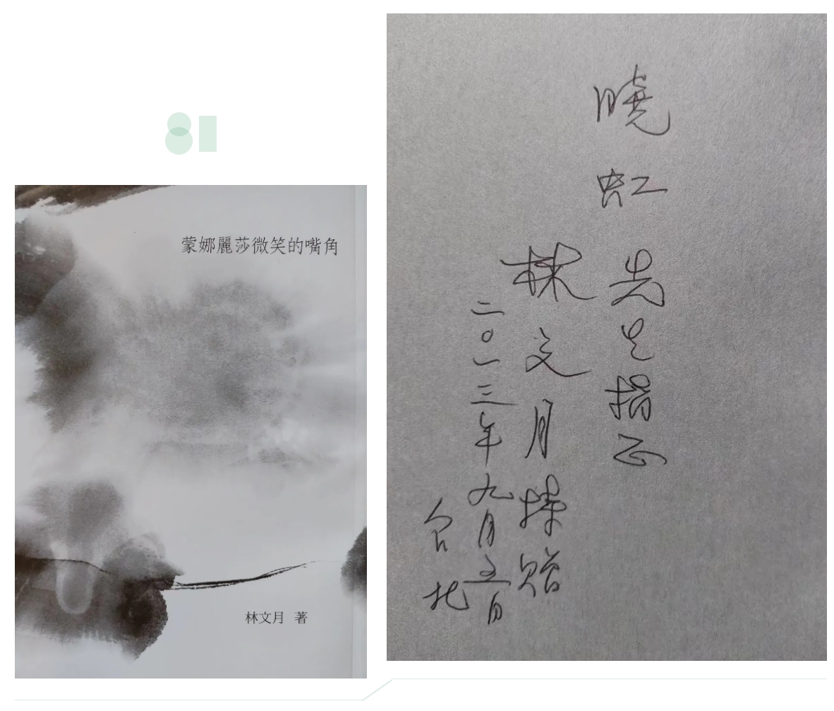 此次臺灣之行最大的收獲是,得到了林文月先生的簽名贈書。這是她的一本文藝評論集,2009年由臺北有鹿文化公司出版的《蒙娜麗莎微笑的嘴角》。這個書名讓我聯(lián)想到林先生的笑容。書中收錄的近半文章,包括《擬古》,原先都是作為演講稿寫作的。我在介紹各篇來歷的《自序》中,還是會看到“為我壯膽不少”“難免有些心悸”這類話。我不知道這是不是林先生生前編印的最后一本書,我仍然從中窺見了林先生做得那么出色的教學(xué)和研究,也就是她的“正業(yè)”,可能并不是她喜歡的事,而創(chuàng)作和翻譯才是她的最愛。