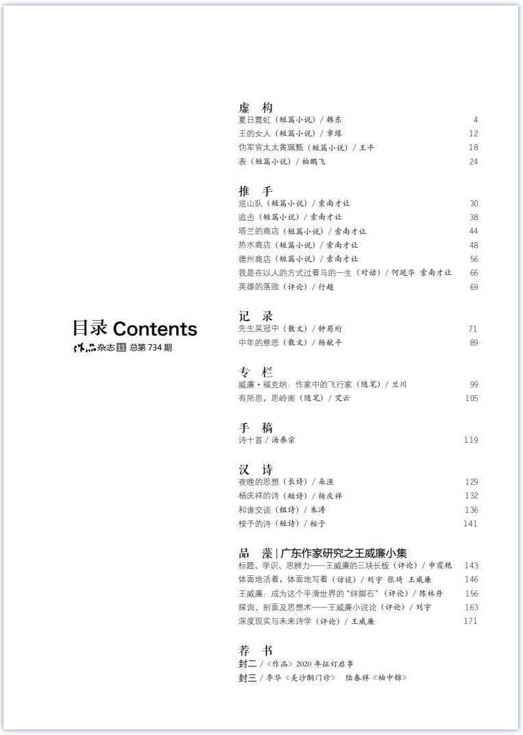 一次和小瓊談到這個話題,我說何不將評判權交給年輕人,“90后寫,90后編”。小瓊以為然。她執(zhí)行力超級強,將欄目改成“90后推90后”,建起500人的微信群,設計了接龍的形式,一期刊發(fā)一男一女兩位“90后”的小說,下一期由上一期的作者任初選編輯,負責從投稿中選出3篇作品,再由500人群的年輕人投票決選出下一期的上稿者,依此類推,選定稿件后,我們才介入后續(xù)的編輯工作。后又邀請尚在中大讀博的徐威開設“90后文學觀察”的評論欄目,形成了“90后寫、90后編、90后評”的生態(tài)。這一舉措引起了文壇的關注,《文藝報》聯(lián)合《作品》合辦了“新天90后”欄目,從此,“90后”作家成為各大文學期刊爭相約稿的對象,今天活躍的“90后”寫作者,很大一部分就是從《作品》和“新天90后”起步的,《作品》雜志也因此獲得了年輕人的信任,我們也嘗到了力推年輕人的甜頭。