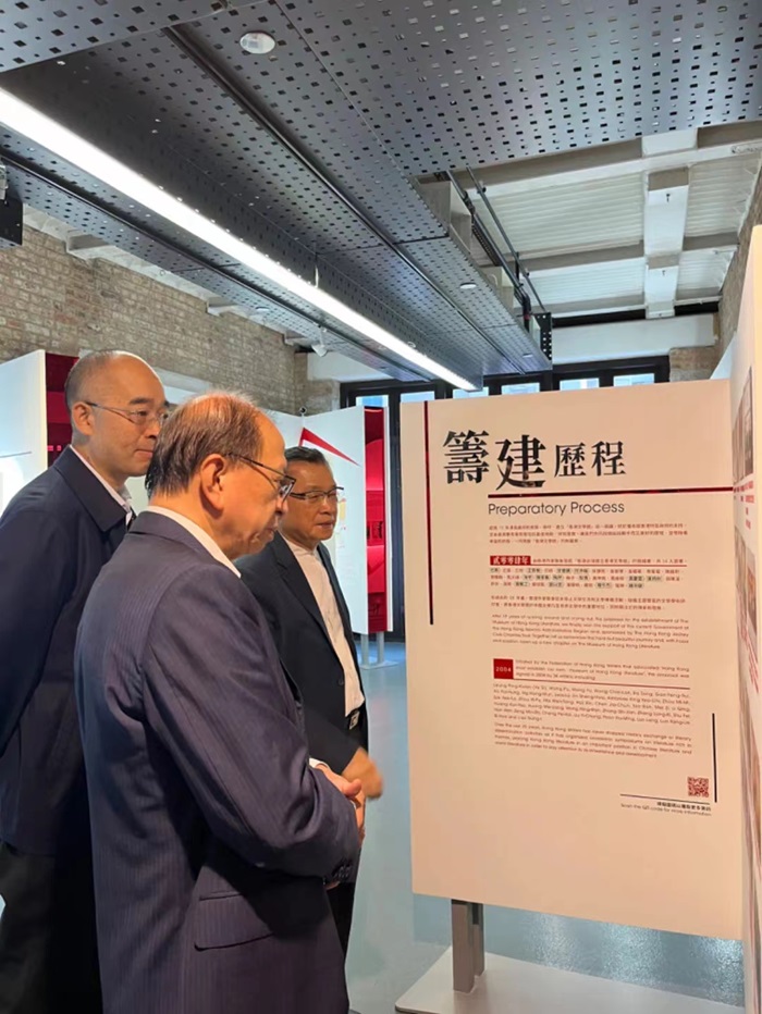 潘耀明(左)為吳義勤(中)介紹香港文學(xué)館成立歷程