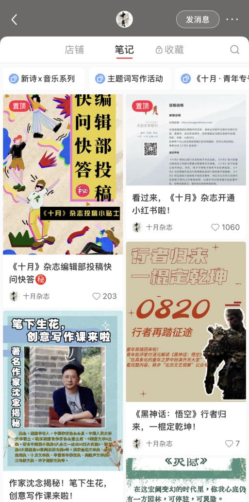 其實,在近兩年的雜志宣發(fā)工作中,小紅書正是《十月》的一張亮眼名片。自2023年夏天創(chuàng)設以來,“十月雜志”小紅書號始終以輕松、活潑的形式推送文學作品和文壇訊息,運營一年內(nèi)粉絲數(shù)已經(jīng)超過1.8萬,打造了多篇爆款推文,并于2023年年底榮獲“第九屆年度書業(yè)營銷推選”最受歡迎新媒體賬號。在專題策劃方面,我們首創(chuàng)推出了“文化探店系列”——以短視頻的形式帶領讀者線上“種草”全國各大城市的特色書店,比如北京的萬圣書園、三聯(lián)韜奮書店、涵芬樓書店,南京的先鋒書店等,為讀者探尋精神食糧。執(zhí)行主編季亞婭認為,作為傳播載體的文學期刊有其獨特的媒介屬性,它介于圖書出版和報紙傳媒之間,比圖書周期更短、能夠更加靈活地組稿,較報紙周期更長、能夠承載更具深度的內(nèi)容。而小紅書是近幾年來廣受年輕受眾歡迎的新媒體,也已經(jīng)是中文互聯(lián)網(wǎng)最便捷的資訊搜索、傳播工具之一,我們可以最大限度地利用其媒介屬性和特點,以辦報紙的意識來運營新媒體,及時關注文學圈各種最新資訊,將其呈現(xiàn)給受眾用戶。