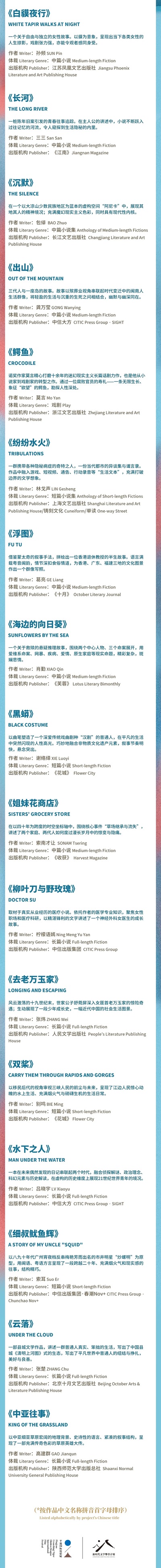 17部入圍推薦作品由“遷徙計(jì)劃”9位推薦委員會(huì)成員分別從題材創(chuàng)新性,作品影視改編的可行性,拓展文學(xué)邊界、豐富影視創(chuàng)作的可能性等維度出發(fā),從《人民文學(xué)》《收獲》《十月》、人民文學(xué)出版社、江蘇鳳凰文藝出版社、中信出版社、譯林出版社等34家中國(guó)作家協(xié)會(huì)“新時(shí)代文學(xué)攀登計(jì)劃”聯(lián)席會(huì)議成員單位的87部初推文學(xué)作品中精選得出。