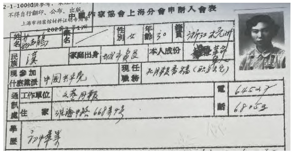 9《中國(guó)作家協(xié)會(huì)上海分會(huì)申請(qǐng)入會(huì)表》(茹志鵑),上海檔案館藏,檔號(hào):C52-1-100-1。