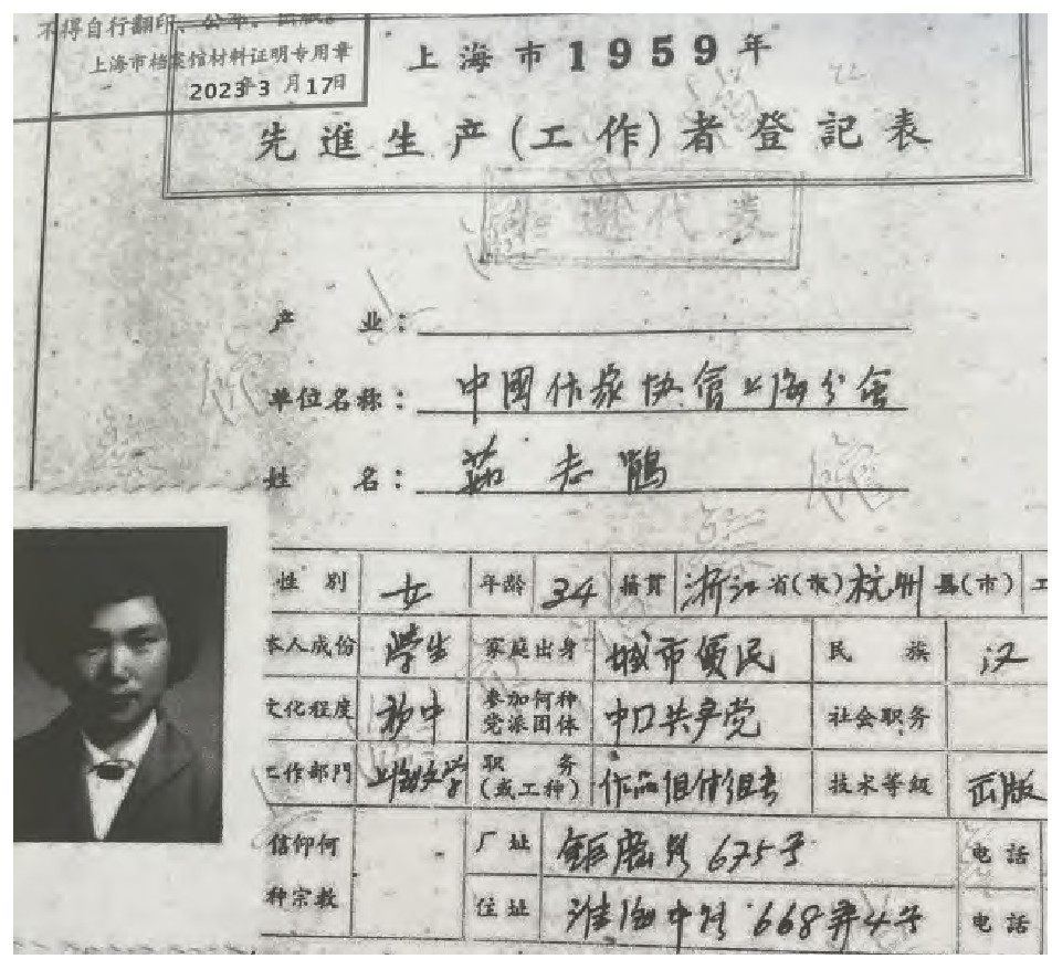 15《上海市1959年先進(jìn)生產(chǎn)工作者登記表》(茹志鵑),上海檔案館藏,檔號(hào):C1-2-3004-95。