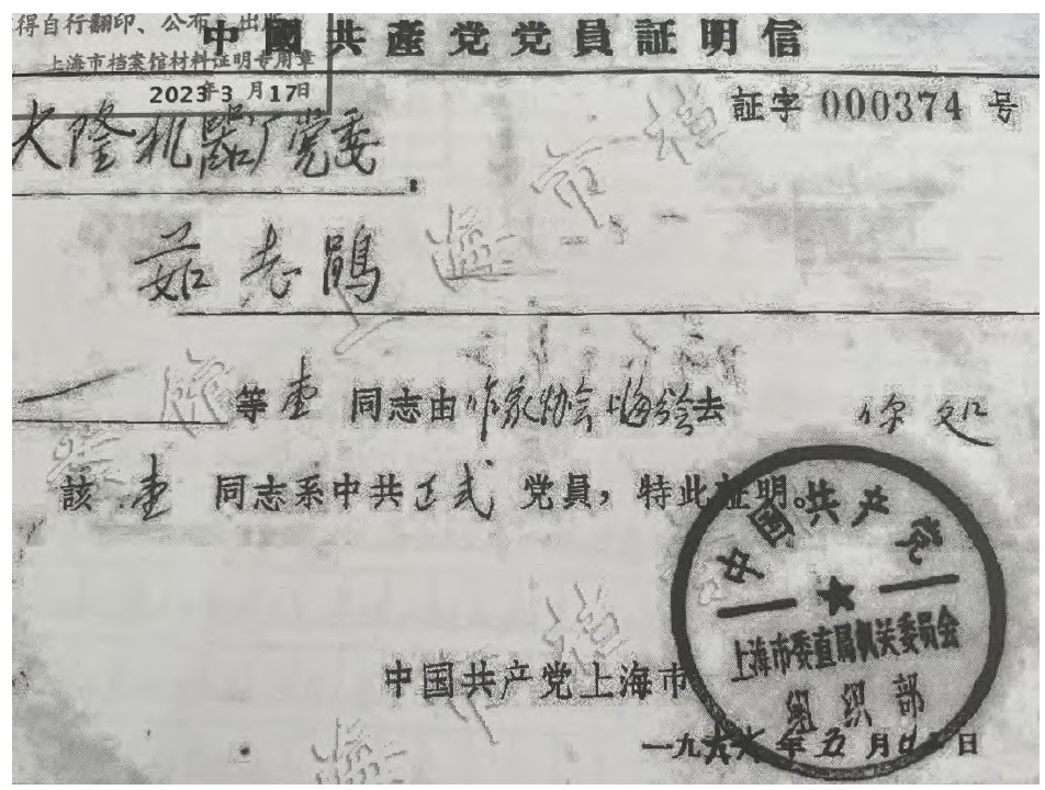 19《中國(guó)共產(chǎn)黨黨員證明信》,上海檔案館藏,檔號(hào):C110-2-93-10。