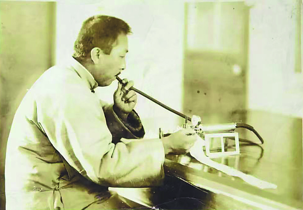 圖為劉半農(nóng)正在做語(yǔ)音實(shí)驗(yàn),以及他發(fā)明的語(yǔ)音實(shí)驗(yàn)儀器