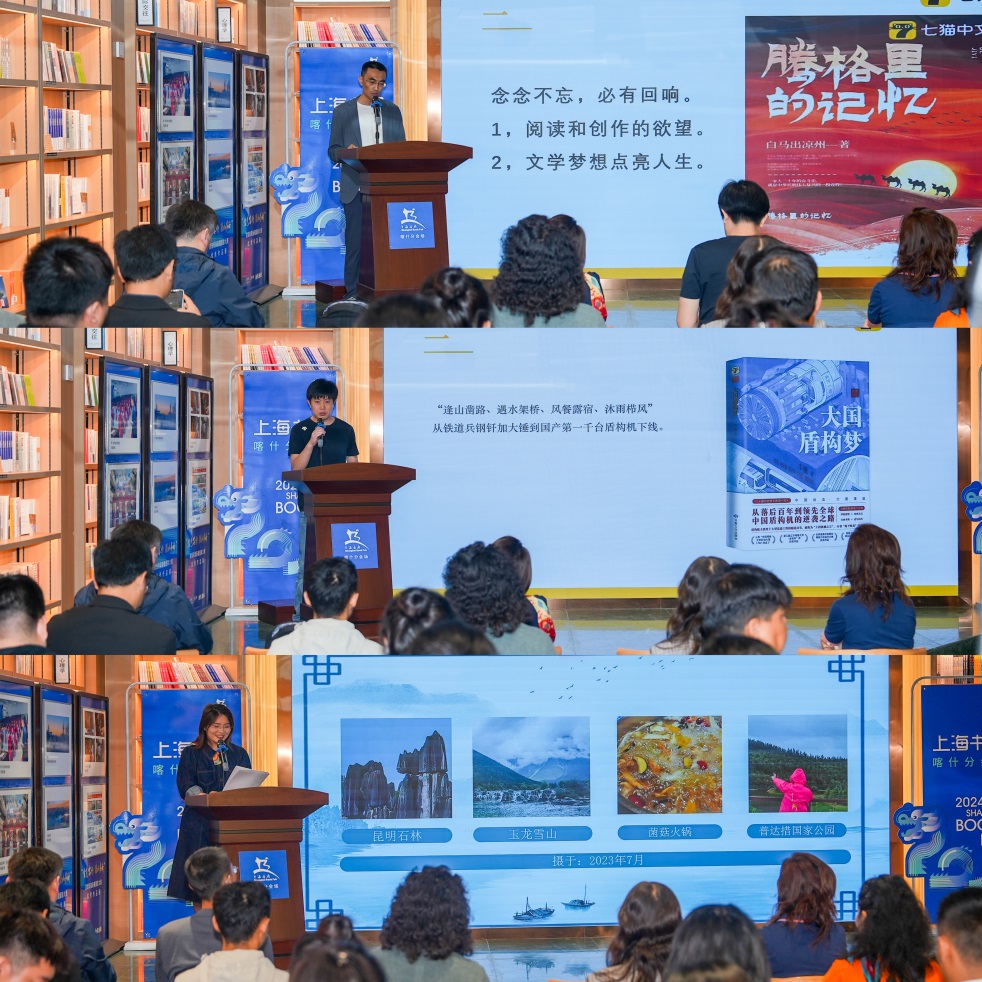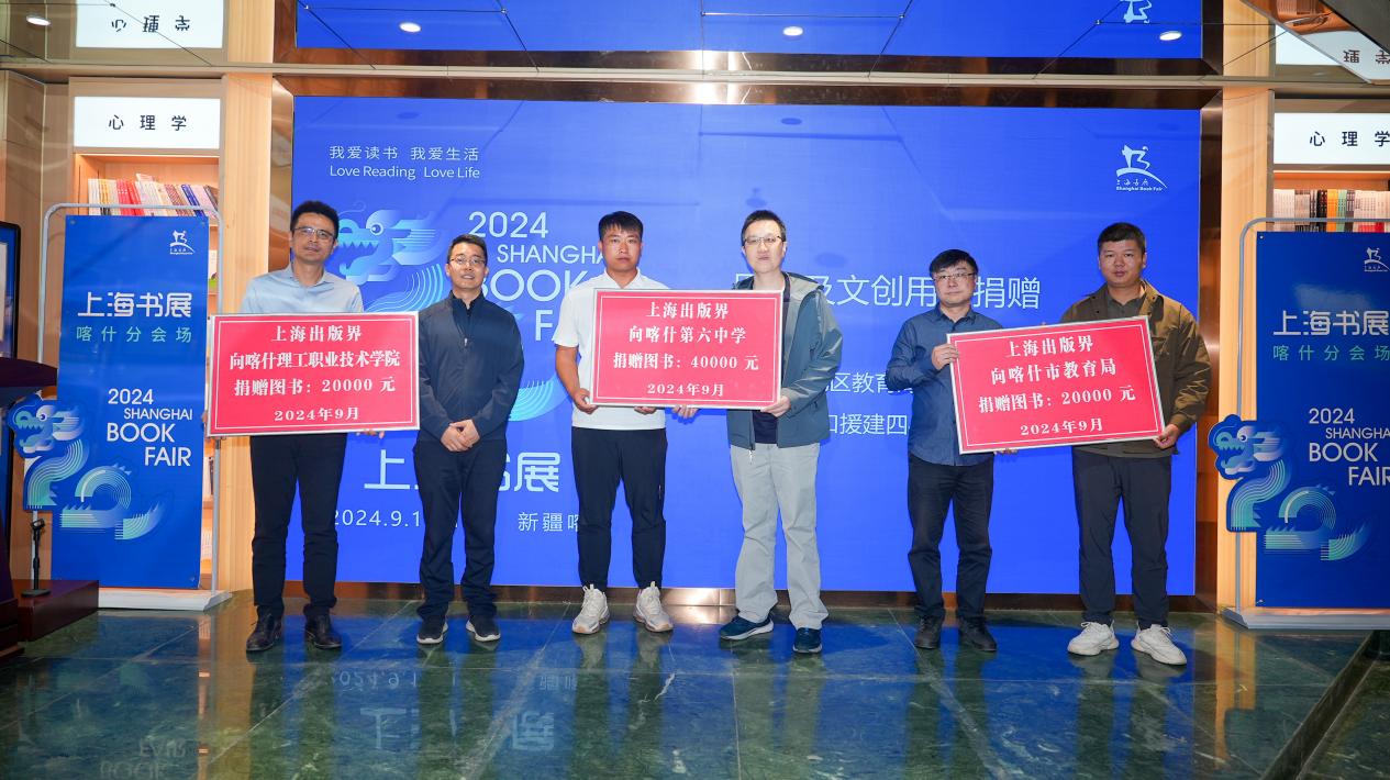 開幕式上,上海出版界分別向喀什教育局、喀什第六中學、喀什理工職業(yè)技術學院、上海市對口援建四縣教育局捐贈圖書,其中也包括七貓捐贈的《劍來》《大國盾構夢》《蒼穹之盾》《騰格里的記憶》《穿越微?!贰跺\衣春秋》等14部書,共計200余冊。