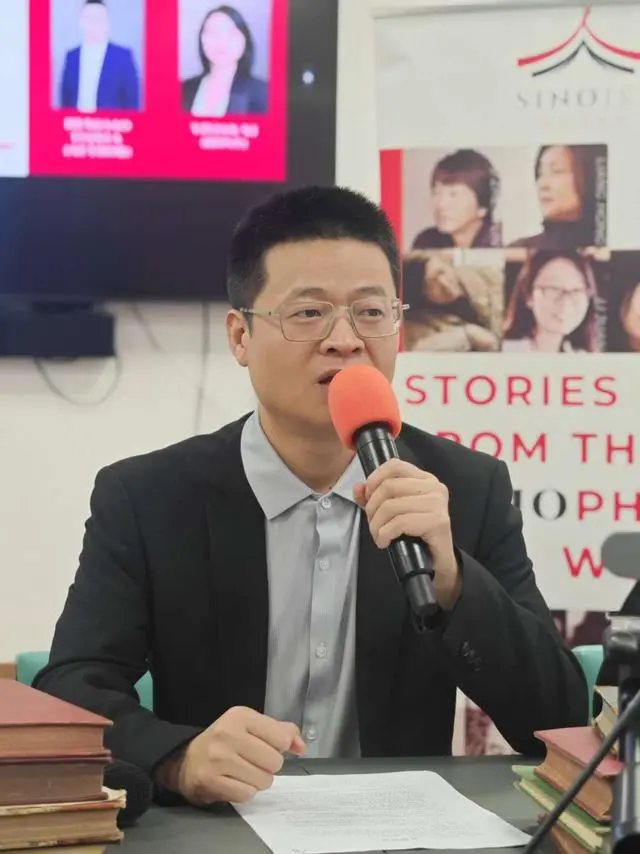 活動當天,作家橫掃天涯在現(xiàn)場發(fā)言。(中國駐英國使館文化處供圖)