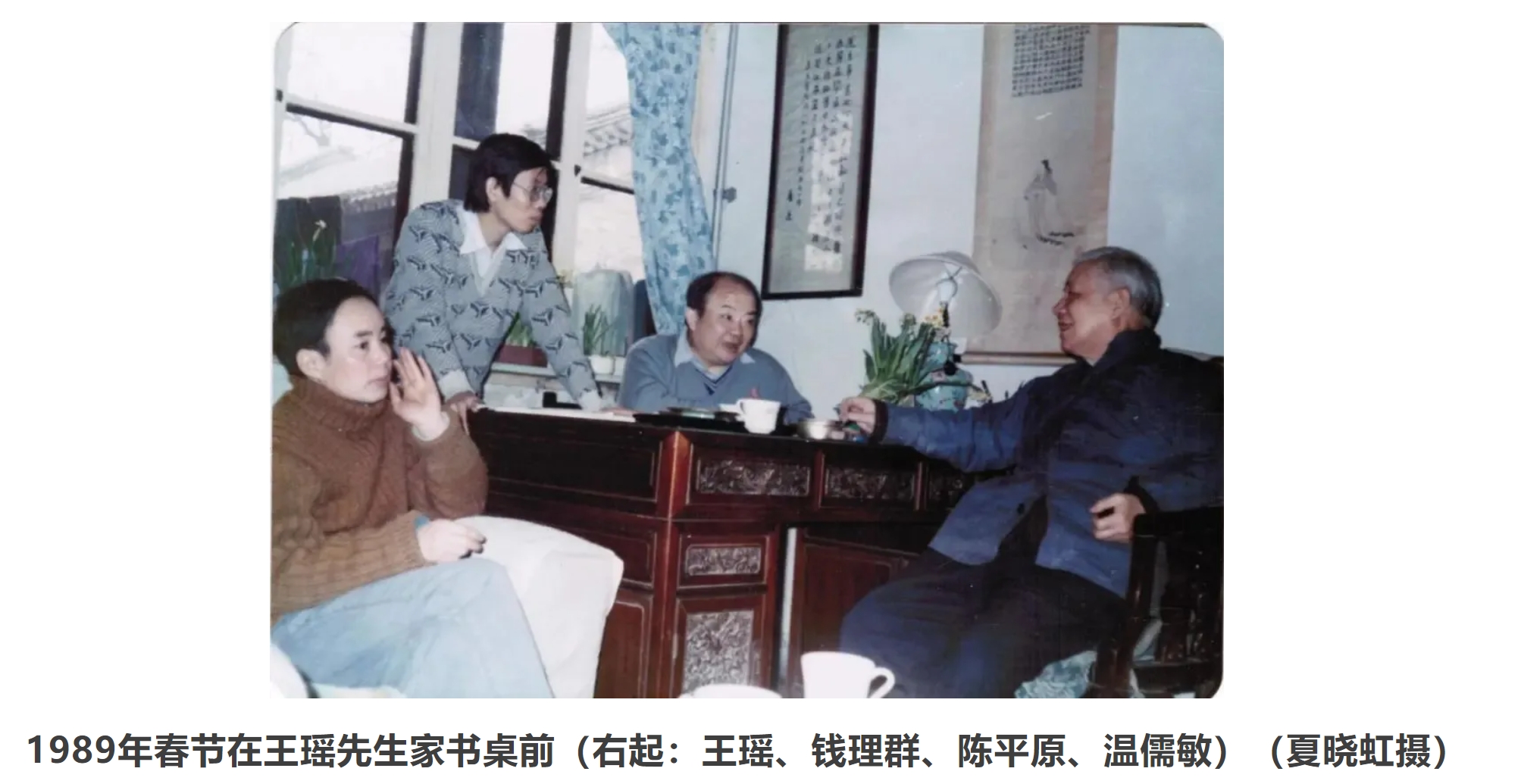 當(dāng)初自信滿滿,可那些“如在眼前”的場景,真要復(fù)原,沒有老照片的幫助,其實很難實現(xiàn)。平日里師友合影,鏡頭都是對準(zhǔn)人物,客廳作為背景,只是露出一角。如今為了學(xué)術(shù)文獻(xiàn)展,需要準(zhǔn)確的方位與尺寸,一下子變得困難重重。當(dāng)然可以隨意布置,那樣外行是看不出來的,可老學(xué)生多有健在者,很容易露餡。模糊的印象大家都有,精確定位卻很不容易。翻查了很多老照片,終于找到夏曉虹1989年春節(jié)拍攝的一張師生合影,因取景角度不同平常,故得以呈現(xiàn)客廳的基本面貌。這張照片因而成為策展人的寶貝——不僅有資考證,幫助重建“虛擬的客廳”,而且可放置在書桌上,供參觀者翻閱對照。