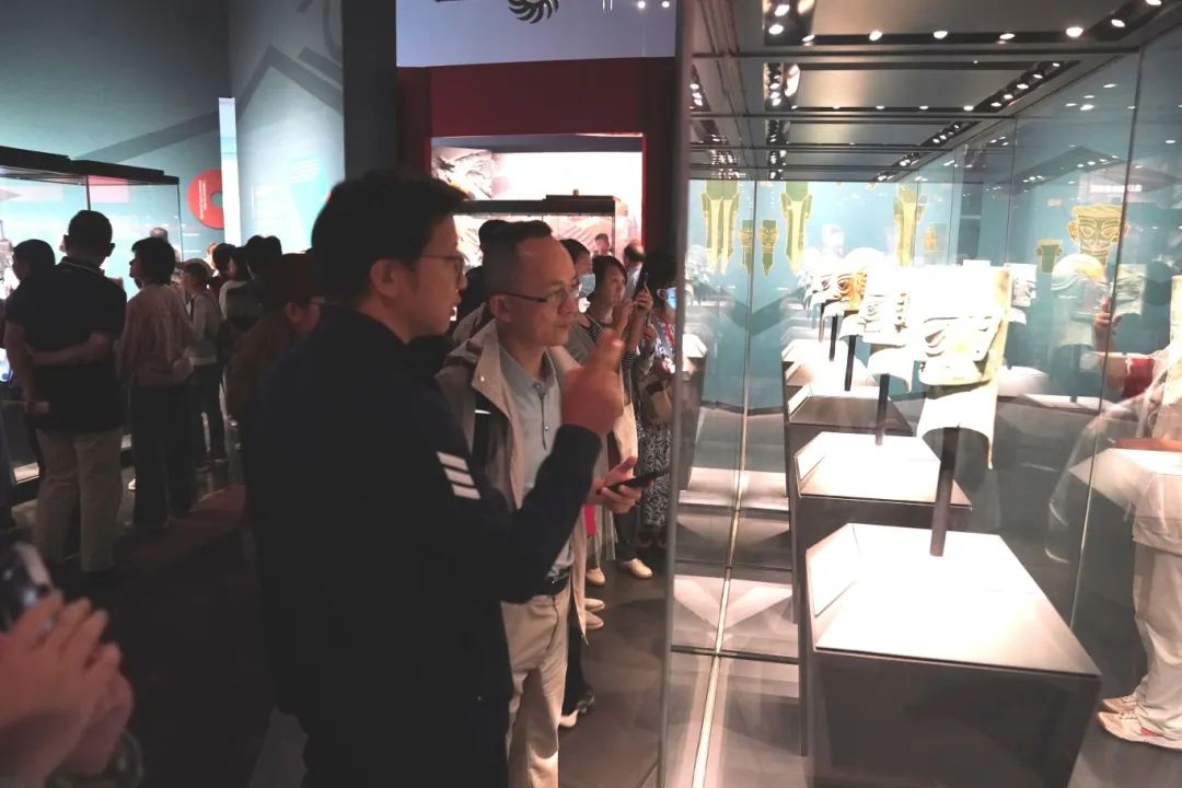 展廳入口處,一面花紋精致、紋樣復(fù)雜的古鏡狀電子顯示屏放映著三星堆與金沙文物的介紹片,青銅大力人、戴冠縱目青銅面具、黃金面具……這些造型奇特的文物不禁讓作家們對(duì)接下來(lái)的參觀充滿期待。展廳內(nèi)人頭攢動(dòng),每一件文物藏品前都圍滿了熱切求知的觀眾,作家們也加入其中,不時(shí)在文物前駐足細(xì)細(xì)觀賞,并拿起手機(jī)拍照記錄展品的精美。通過(guò)參觀,作家們逐步了解了三星堆與金沙文明的歷史背景和考古過(guò)程,收獲頗豐,感慨良多。