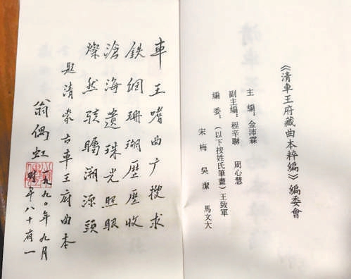翁偶虹先生家里我們也去過多次,每次拿著大摞的《曲本》去請教,哪些是高腔唱本,哪些是昆曲唱本。很多戲曲唱本中既有京腔,也有高腔,有的還有昆曲曲牌,朱家溍先生將之定義為清中晚期出現(xiàn)的“昆亂不擋”時期的“亂彈”。我們決定遵循朱老的建議,不用京劇的名稱,改稱此類為“亂彈”,以反映京劇在北京的發(fā)展與演變過程。書即將出版的時候,我們請翁偶虹先生題詞,翁先生欣然作詩一首:“車王嗜曲廣搜求,鐵網(wǎng)珊瑚歷歷收。滄海遺珠光照眼,燦然駭囑溯源頭。”