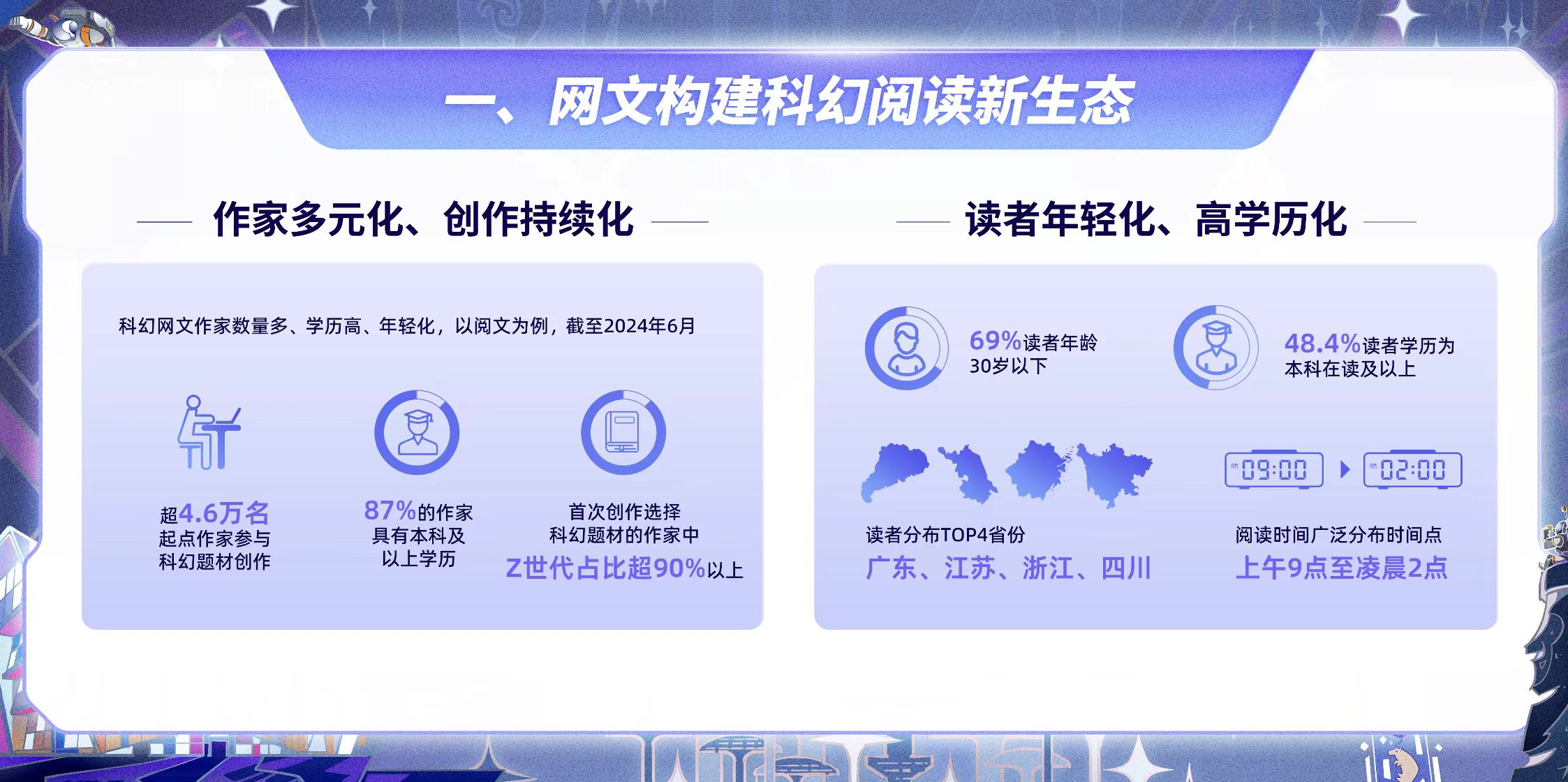 科幻網(wǎng)文佳作頻出背后,是網(wǎng)絡文學作者陣營和讀者大盤的不斷擴大。截至2024年6月,超4.6萬位閱文作家選擇科幻題材創(chuàng)作,87%的作家具有本科在讀及以上學歷,科幻新人作家Z世代占比超90%。隨著科幻題材的發(fā)展,作家分布結構也愈發(fā)健康,以天瑞說符代表的中流砥柱持續(xù)產(chǎn)出,以城城與蟬為代表的新生代作家日漸崛起,以我吃西紅柿為代表的頭部作家漸次轉向科幻題材,以須尾俱全、柯遙42為代表的女性作家紛紛入局,極大豐富了科幻題材的多元表達,“科幻+”也日益成為新的創(chuàng)作趨勢。